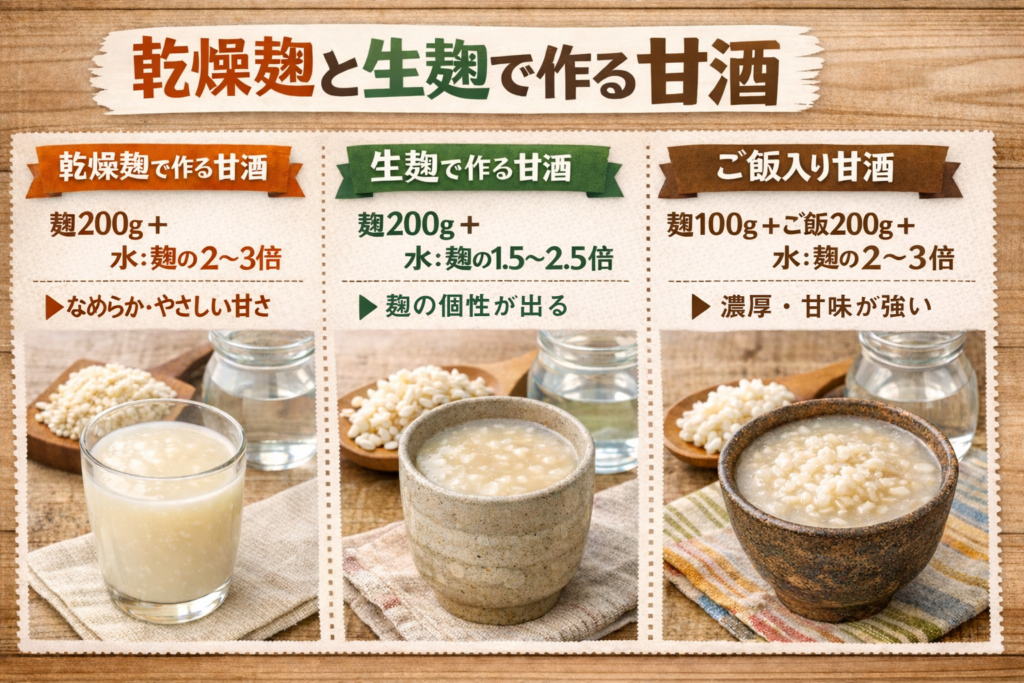 | 乾燥麹+水 | 麹の2〜3倍 | なめらか・やさしい甘さ |