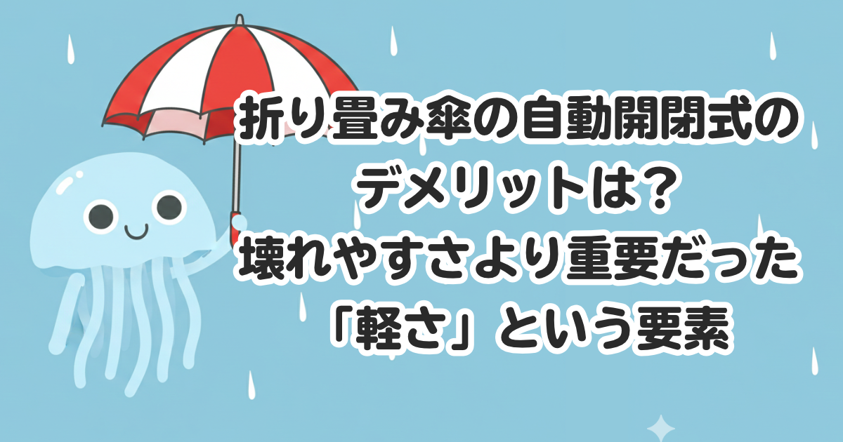 この記事では、自動開閉式折り畳み傘の一般的なデメリットを整理しつつ、実際に使って分かった「軽さ」の目安や該当する商品について詳しく紹介します。